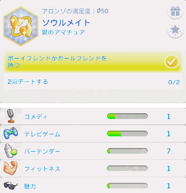 願望はソウルメイトなので、割と達成しやすいかな。スキルはバーテンダーをしていたのも納得です。