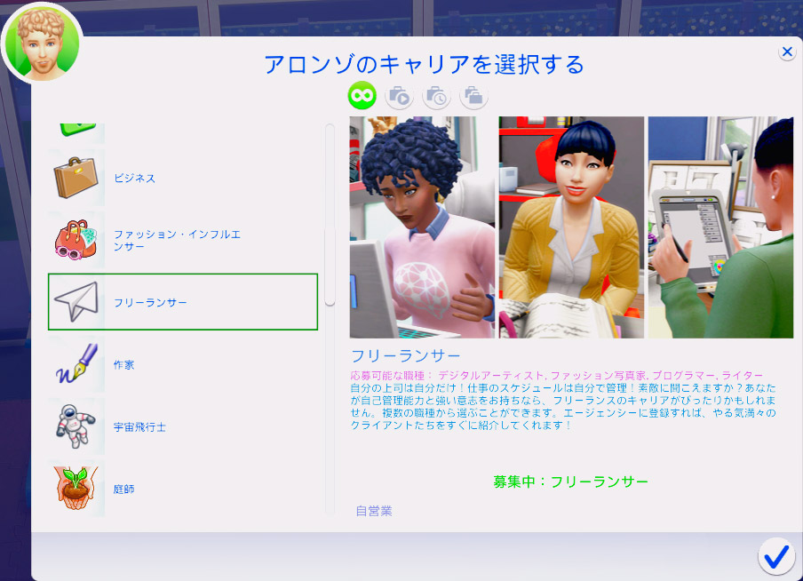 アルマが科学者として月曜日から金曜日の朝十時~夜七時まで家にいないので、アロンゾさんはフリーランサーの職についてもらいます。