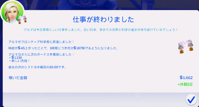 タスクに沿って同僚に話しかけたり、同僚にSimRayを使ったり、空いた時間に採取や釣りをしたりしているので、代わり映えしないんですよね……。