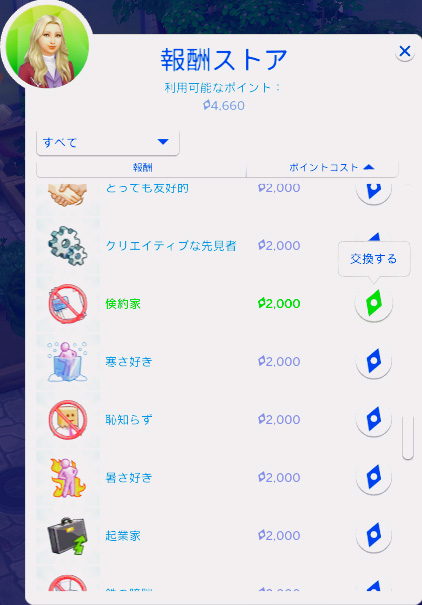 満足ポイントが貯まっていたので、少し悩んだのですが倹約家を取っておきます。収入はだいぶ安定してきましたが、少しでも支出は減らしておきたいな、と思ったので。