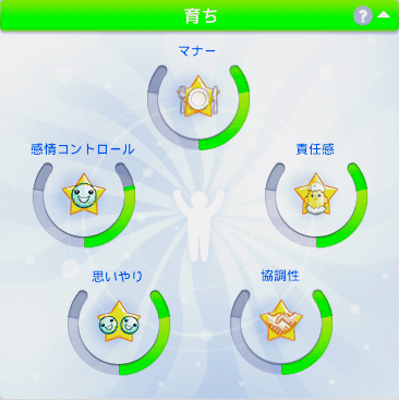 子供~ティーン時代のイベントで協調性が上がる選択肢がいくつかあったので、それを選んでいたらこうなりました。それのせいで感情コントロールやマナーや責任感が下がりましたが……。