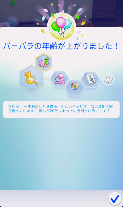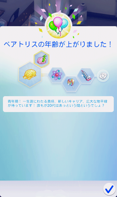 ベアトリスの全ての「育ち」を良い特質が得られるところまで上げたので、誕生パーティーを開きます。
