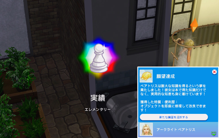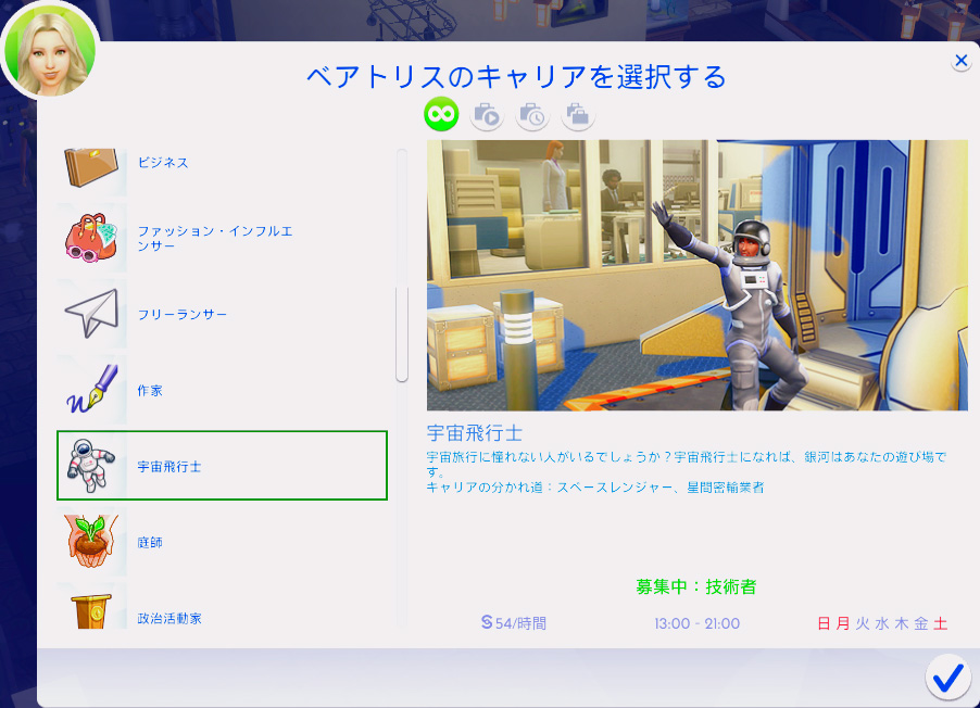 何の職業に就いてもらうか全く決めてなかったのですが、スキル的にベアトリスが一番昇進しやすそうなのは宇宙飛行士かな、と思ったので宇宙飛行士になってもらいました。