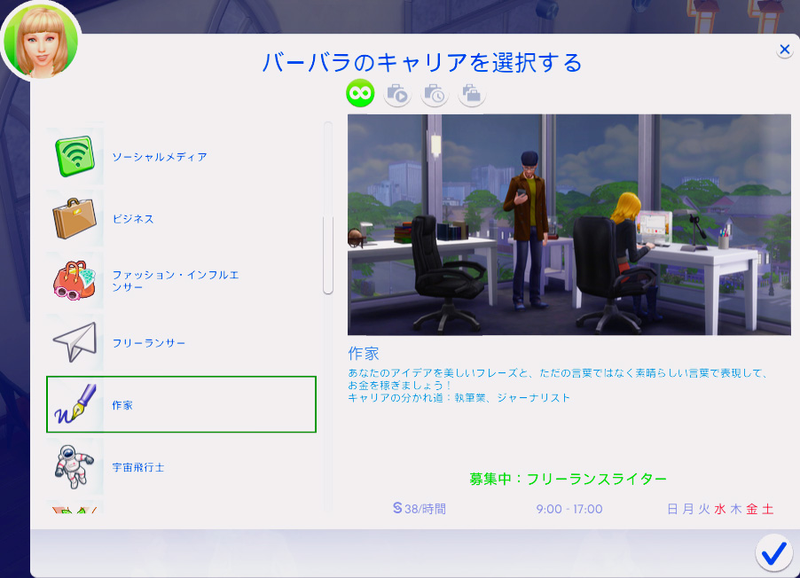 バーバラも同じく決めてなかったのですが、考古学者願望でバイオリンスキルの次に執筆スキルが高いので、じゃあ何か書く仕事がいいかな~~と思ったので作家に。