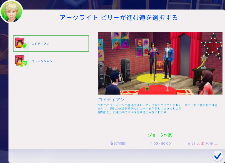 画像ではコメディアンの方を選択していますが、実際はちゃんとミュージシャンを選びました。