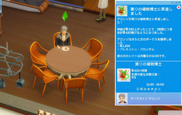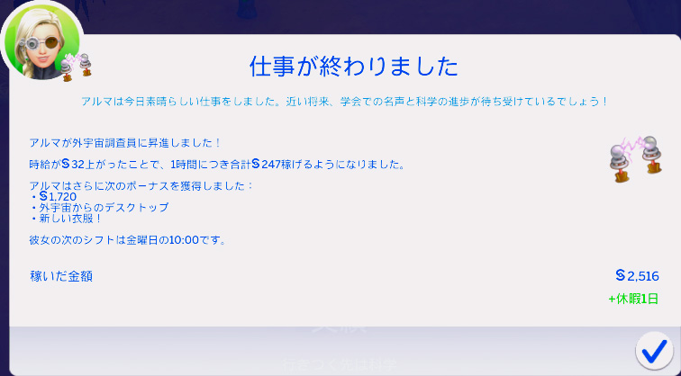 アルマが科学者キャリアを極めた翌日、アロンゾさんもキャリアレベル10に。