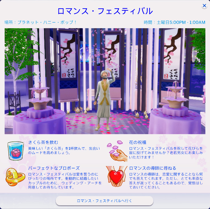 大晦日はカウントダウンの番組を見るタスク? があるので、テレビがあるところへ出かけなきゃいけないな~~と思いながらそれぞれのスキル上げをしていると、ロマンス・フェスティバルの通知が来たので行ってみることにしました。