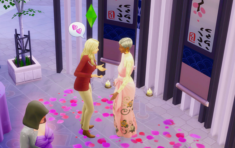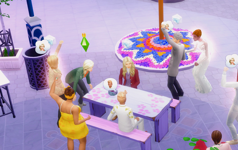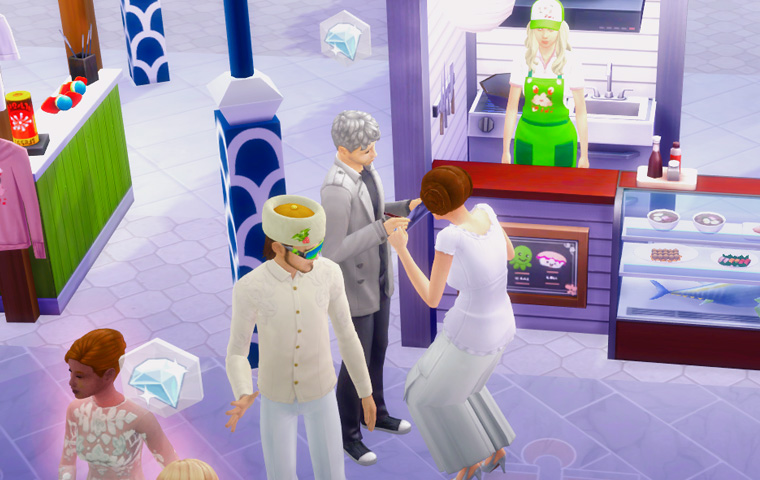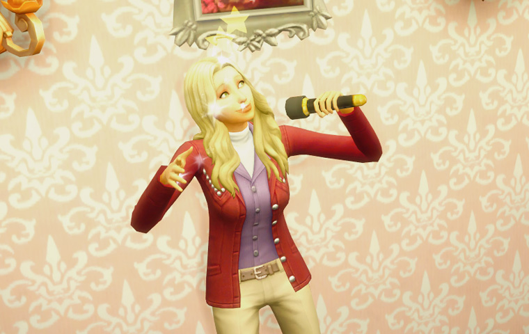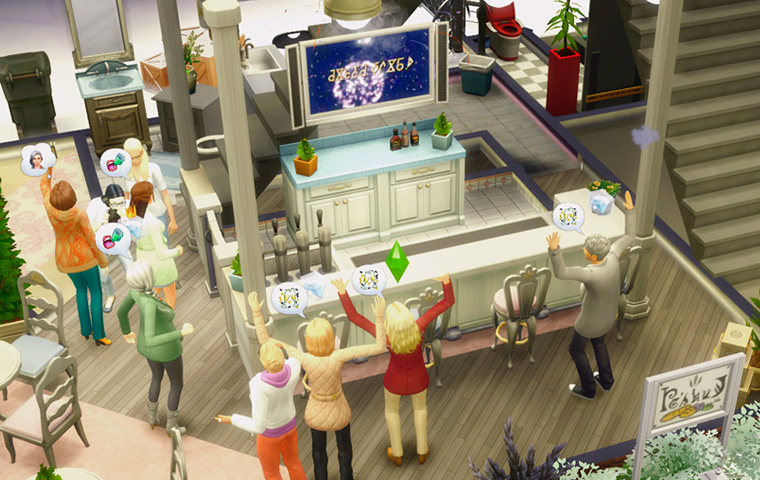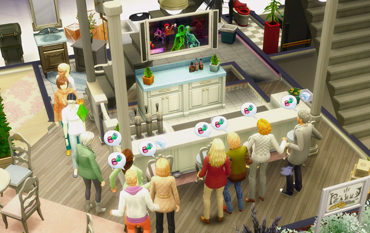 カラオケバーにテレビを見るために(としか思えないほど皆テレビの前に集まる)やって来たシムたちと大盛り上がり。