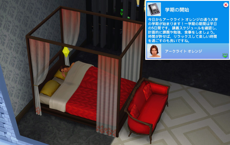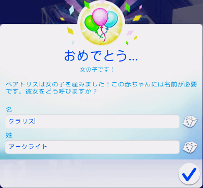 それと、本当ならアルマのときと同じように病院に付き添って子供が生まれるところを見るつもりだったのですが、このプレイの少し前に入ったアップデートで病院の挙動が少しおかしいというか、処置室までは行くんですがその後の動作がキャンセルさせる? みたいなんですよね……。
