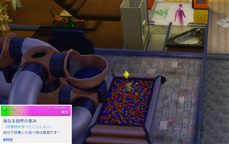 オレンジくんはまだいいんですが、クラリスの悲しみのムードレットをどうにかしないとスキルレベルの上がり方に問題が出てくるので、ちょっと悩んだ末に、極上の作物を食べさせればポジティブなムードレットが上回るはず、ということに気づいたので実行に移し、ついでにボールプールで遊んでもらいました。無事に上回ってくれて安心。