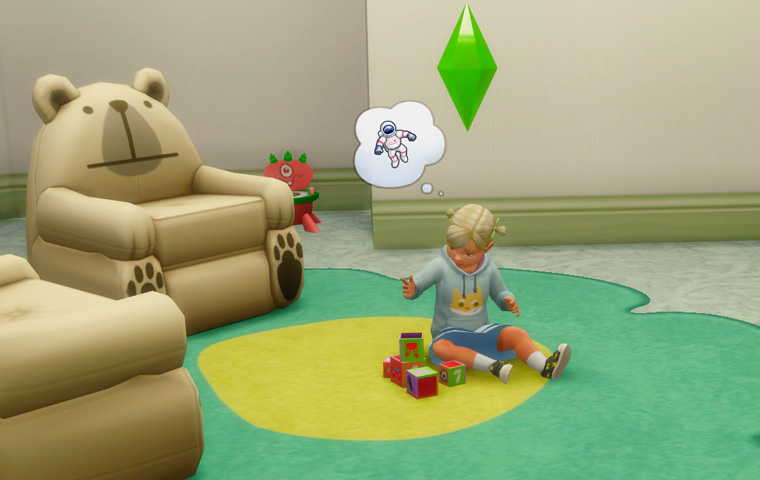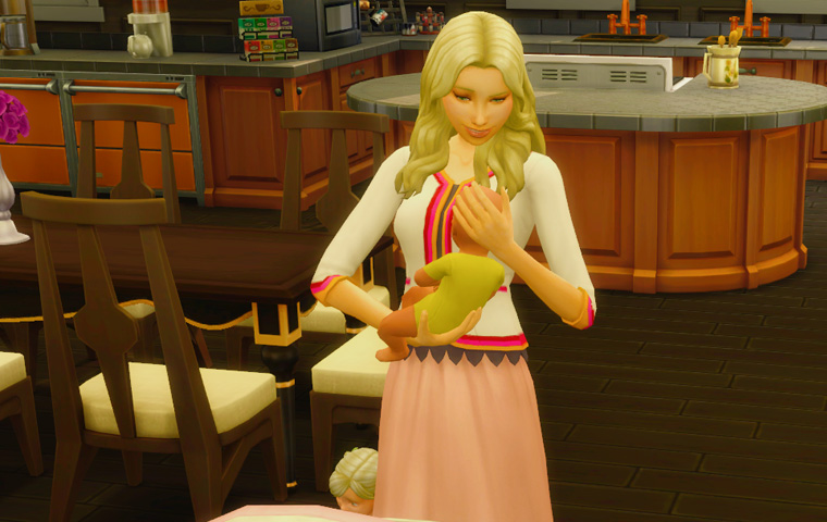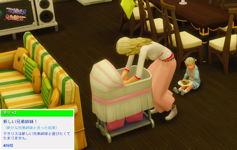 ちょうど陳列ディスプレイから料理を取ったクラリスがソファに向かわず、何故かゆりかごの方に来るな~~と思っていたら、妹を見に来たようです。妹が出来て嬉しいのかな~~。
