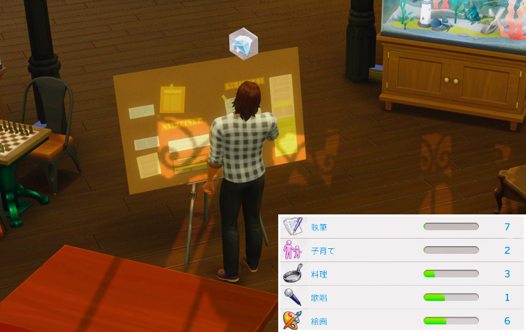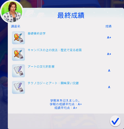 オレンジくんは一学期に四講座詰め込んだ結果、執筆と絵画のスキルがここまで上がっていました。勉強以外ではスキル上げをしていないので(そもそも時間的余裕がほぼない)、大学の課題や講座でここまで上がった状態です。