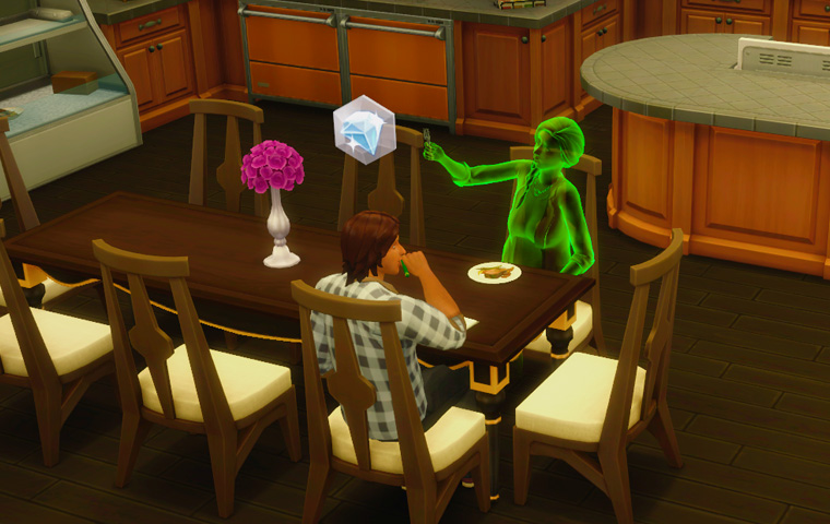 今まで何度か加齢ONプレイはしてきたのですが、家の敷地内に墓を置いたことがなかったのでゴーストが食事するとは思っておらず、びっくりして撮ったスクショです。