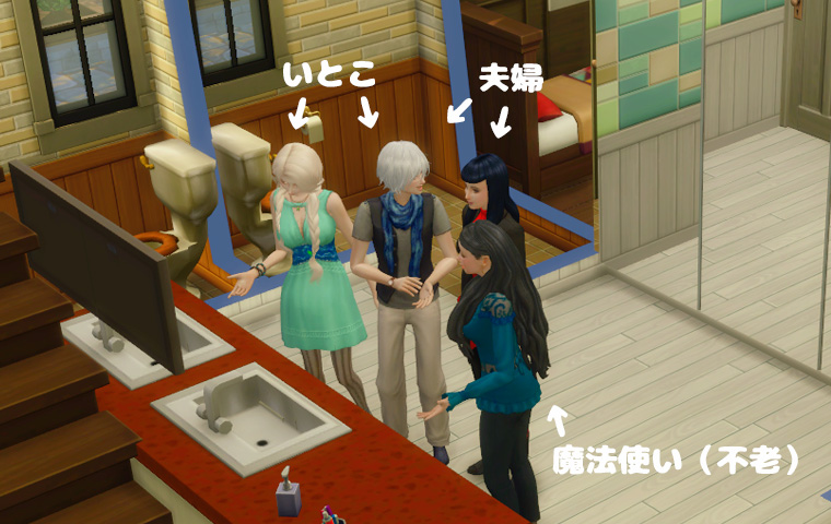 何故かトイレの前にオカルトシムたちが集まっていたので、思わずスクショ撮ってしまいました。ラケーレ以外はヴァンパイアです。