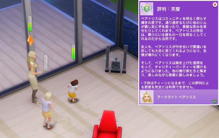 目標に三人同時にダンスするものがあったので、話が盛り上がっているオレンジくん以外の三人で踊っていたら、ベアトリスの評判が完璧になりました。