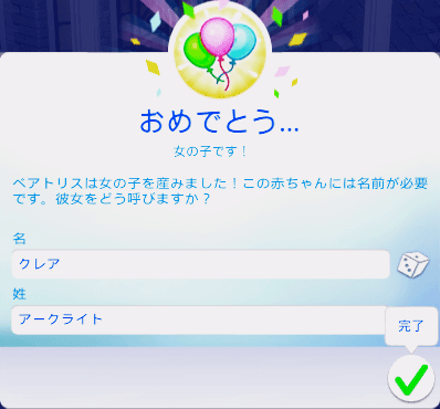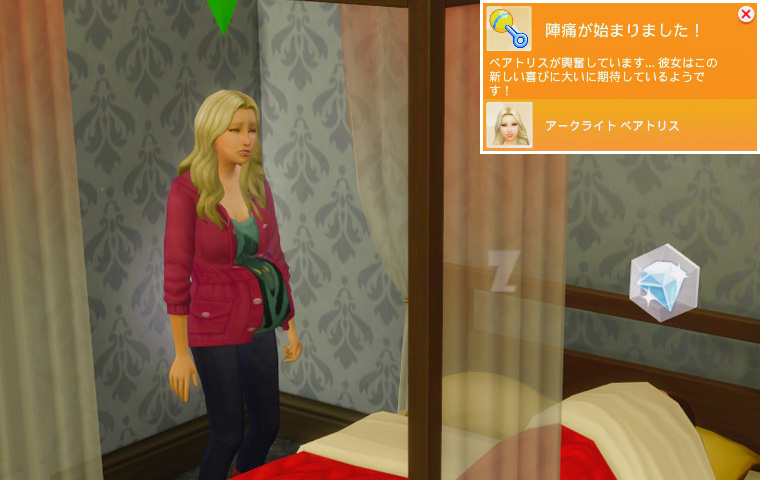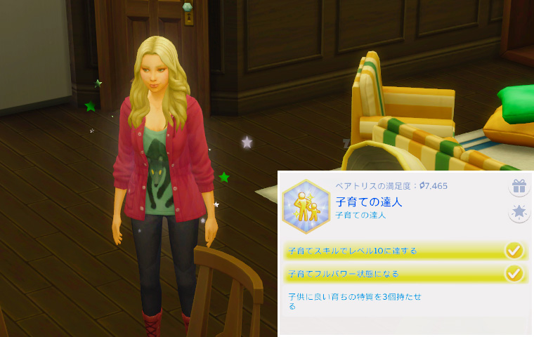 ベアトリスの今の願望は最終段階に入ったので、これは達成出来るかも? と思い、子育てフルパワー状態になってみました。子育てスキルレベル10以上で、子育てに関することを連続して行うとこの状態になります。星が飛ぶのでじっと見ていればわかりやすいはず。