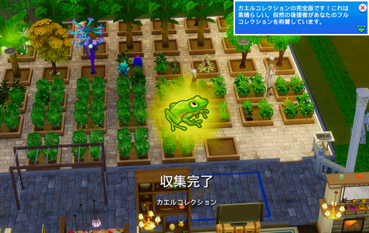 そしてカエルはクラリスが最後の一匹を繁殖で手に入れました。ずっとベアトリス一人で頑張っていたのですが、出なさすぎておそらくこの組み合わせで生まれるだろうと思われるカエル二種をクラリスにも渡してちまちまやり始めたら、三回目くらいで生まれました。