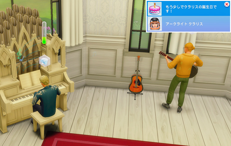 たどたどしく弾いているクライヴを眺めていると、宇宙にコレクションを探しに行っているクラリスの誕生日が近いことを知らせる通知が来ました。クラリスももう大人世代に突入するんですね。