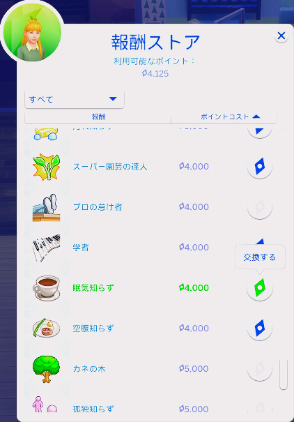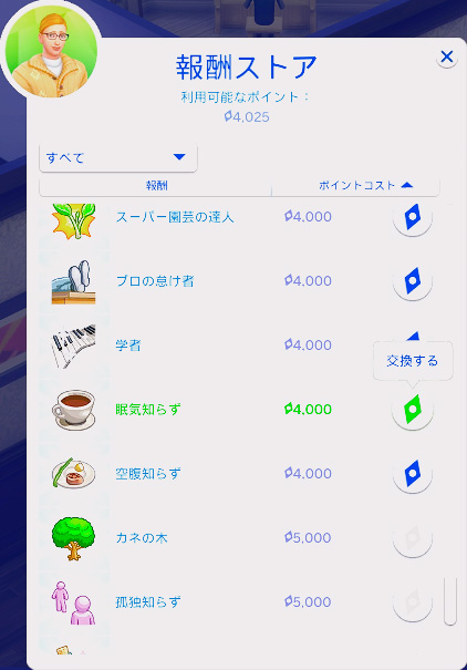 いくつか気まぐれを消化して、無事に満足度ポイントが4000を超えたので、眠気知らずを取ります。これでダライアスくんも生活に余裕が出来ますね。