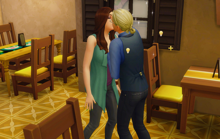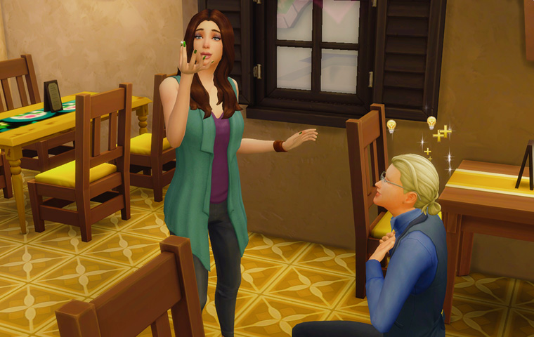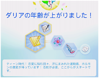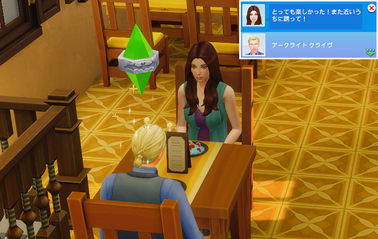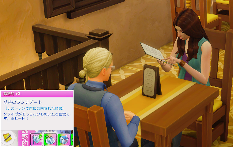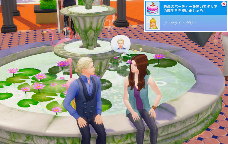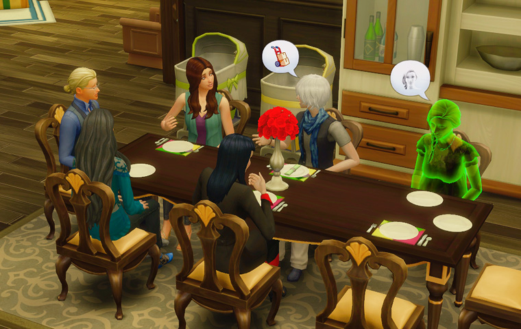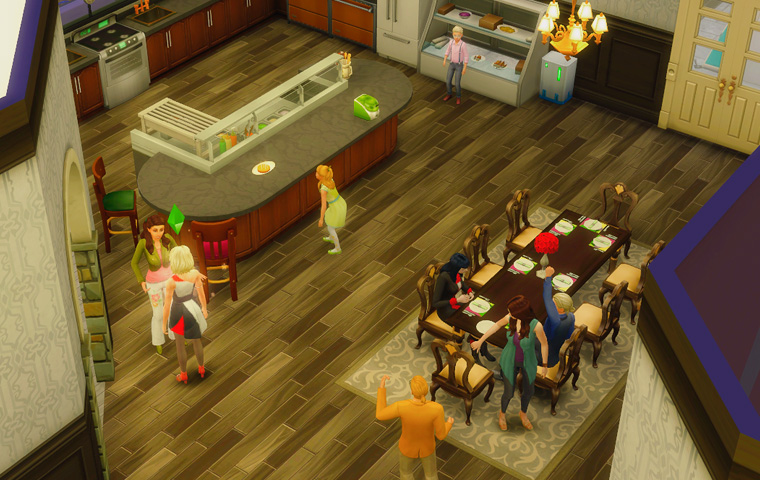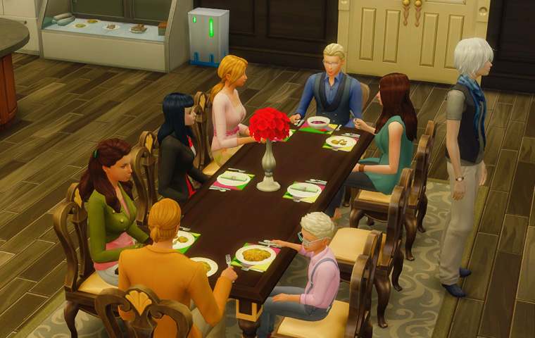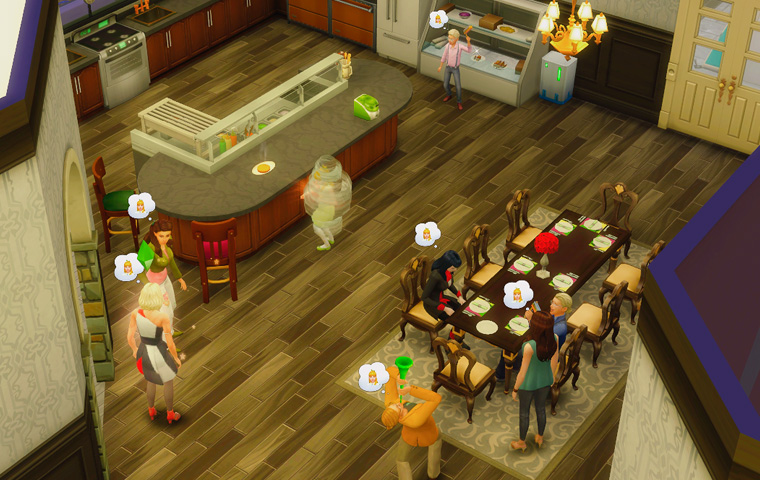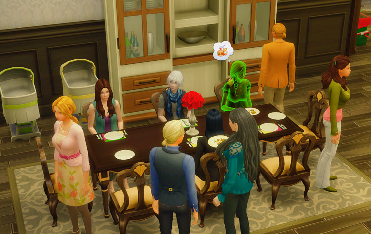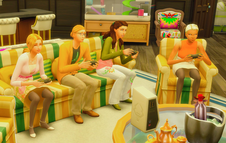 そしてテーブルに背を向けている三人は仲違いをしているわけではなく、パーティーの目標に「シム達に同時にゲームをプレイさせる」が出たので、テレビの前に移動してもらう指示を出した結果のものです。