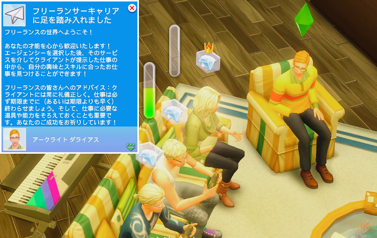 フリーランサーになってすぐ、ゲーム中の家族のもとにやってきたダライアスくんの図。