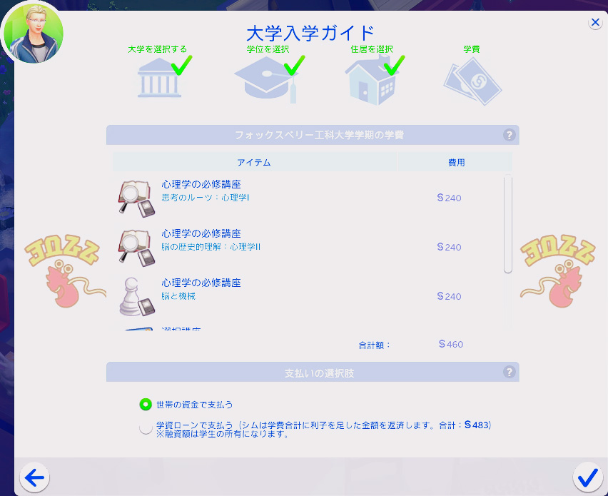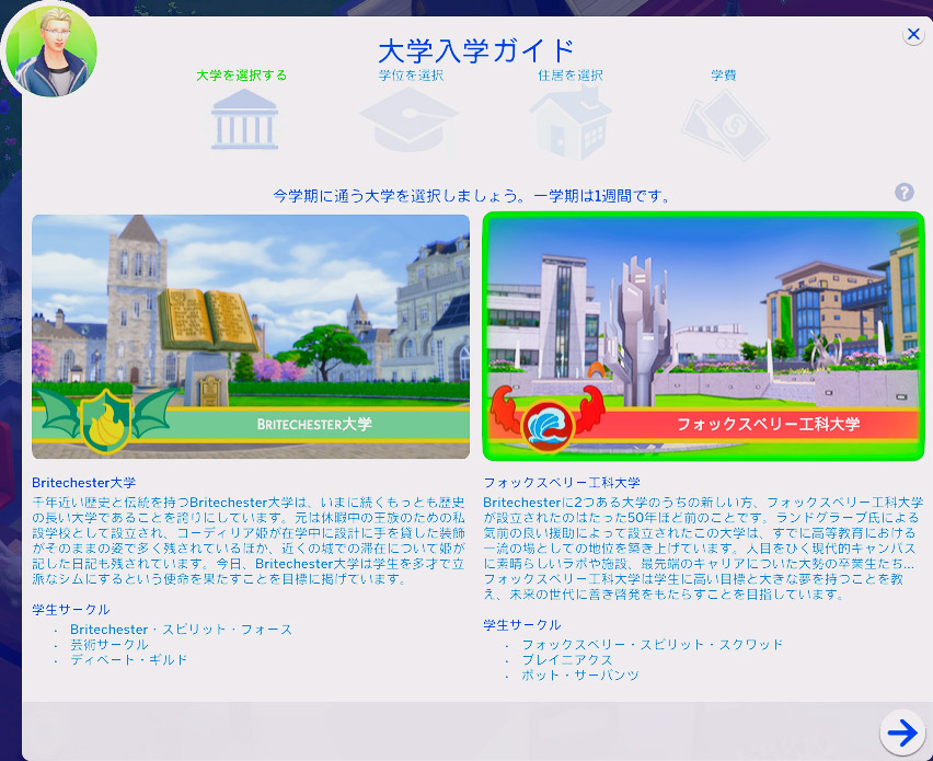 四つ全て学位の講座を取ることも考えましたが、クライヴは論理学スキルが既に結構高いので、別のスキルを上げた方がいいかな、と思い、一つだけ学位に関係のない講座を選択しました。