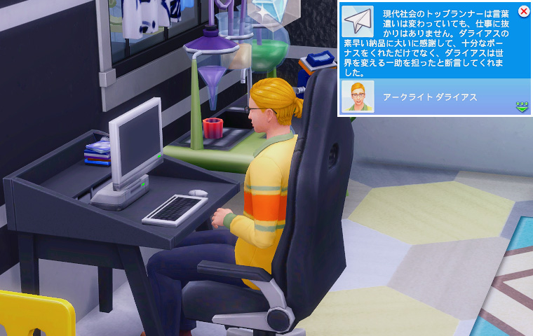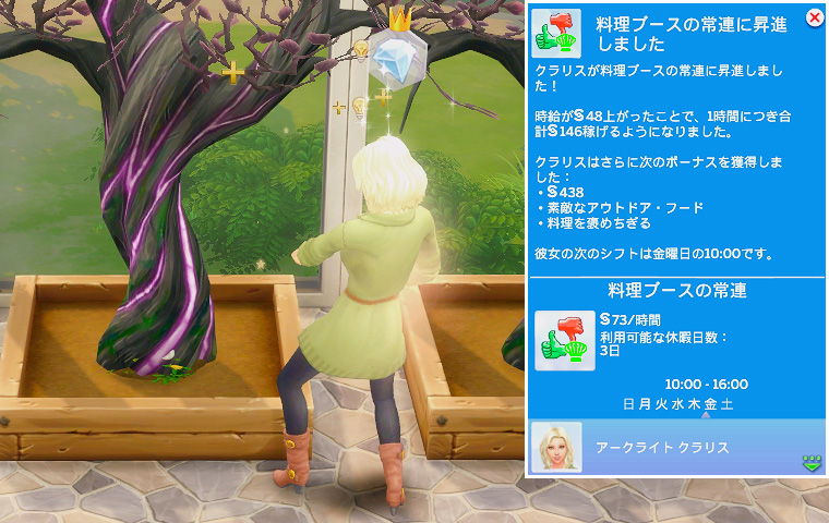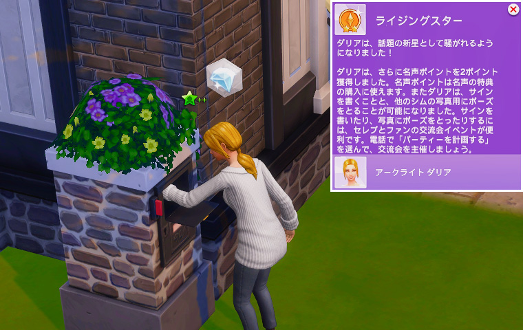 プレイヤーの大変ふわっとした計画が少々見直しになりましたが、母親がヴァンパイアになり、人間に戻るまでの間もずっと一人で執筆活動を続け、本を一冊書き上げたダリアのセレブレベルが上がりました。