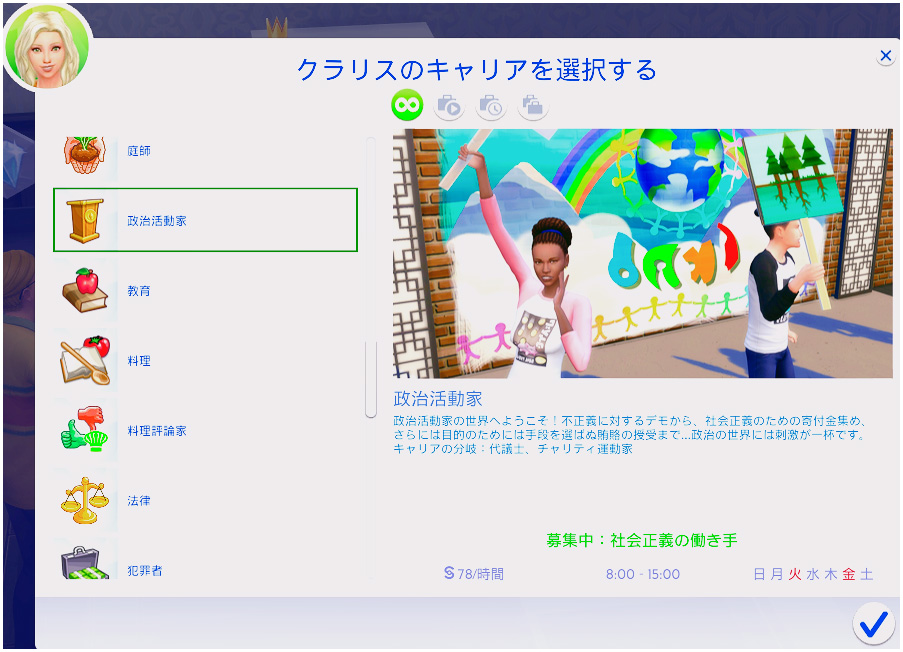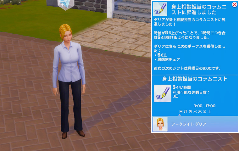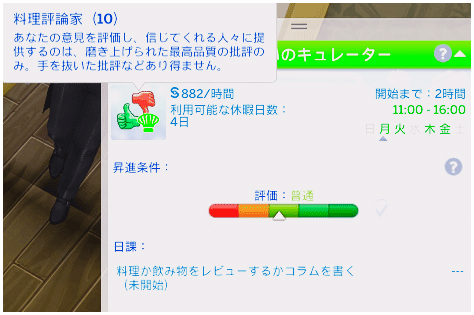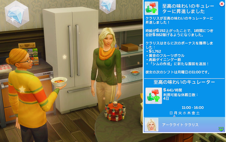 これでクラリスは料理評論家を極めました。主にバグのせいで日課が面倒でしたが、それさえ何とかなれば昇進が早いキャリアだな~、という印象です。