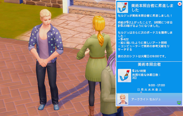 夕方になり、ダリアとセルジュくんが仕事から帰ってきました。セルジュくんは昇進もしていますね。