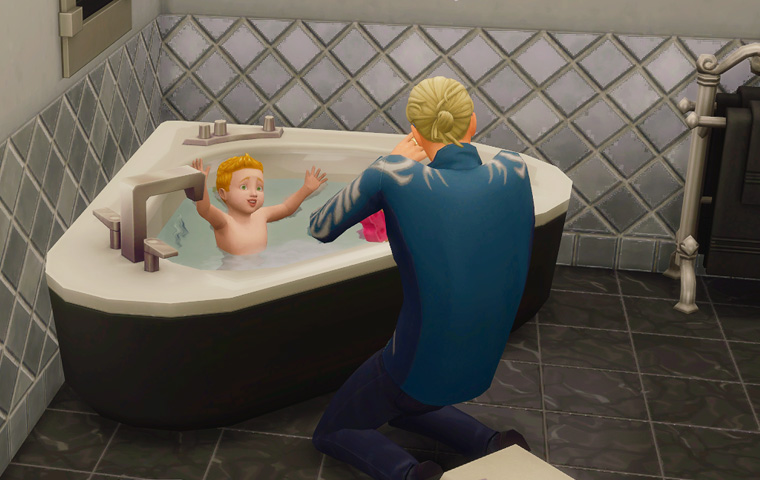 帰ってきたらエルマーが起きていて、衛生も黄色いゲージになっていたので、クライヴにお風呂を頼みました。